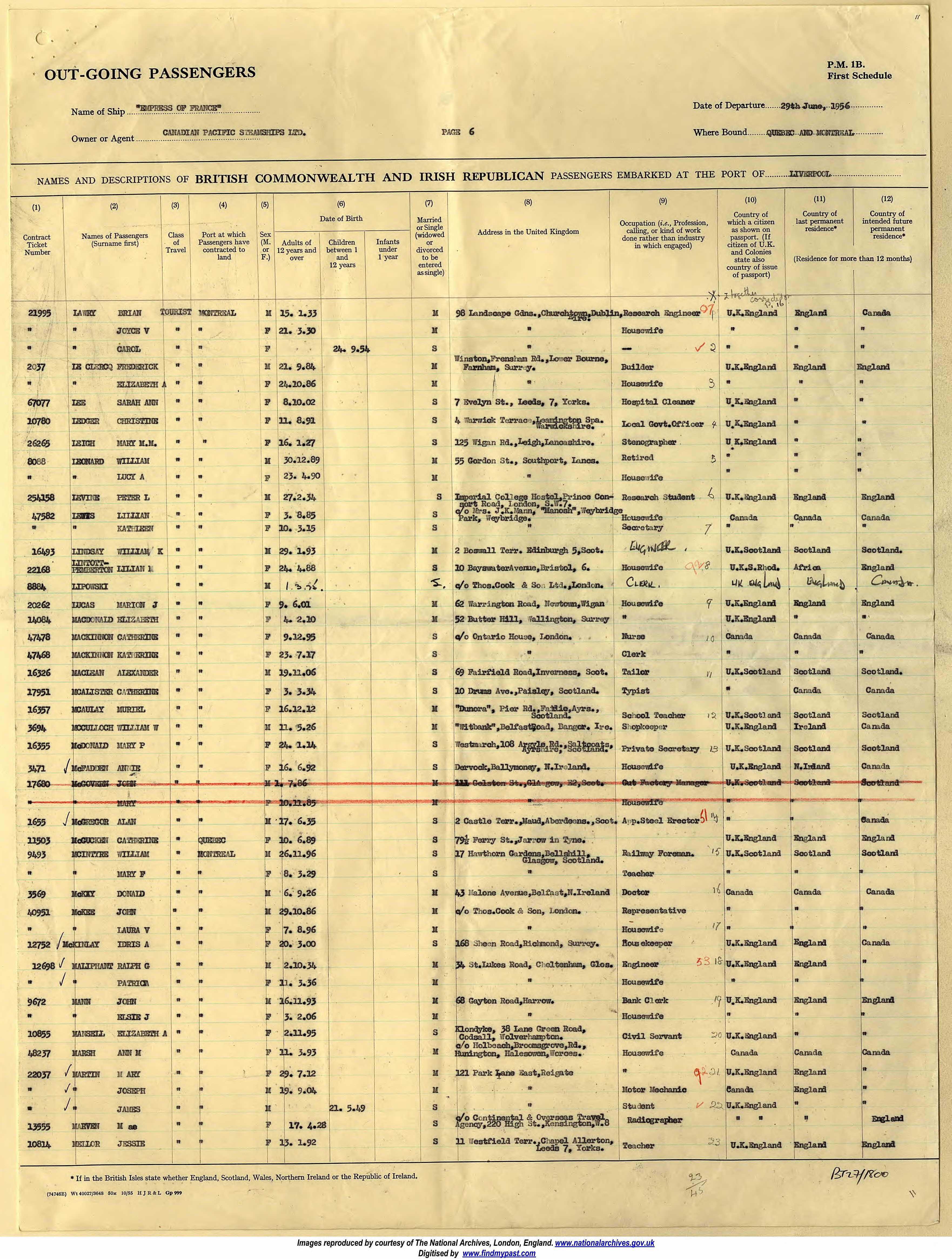 Travelling from U.K. to Canada in 1956