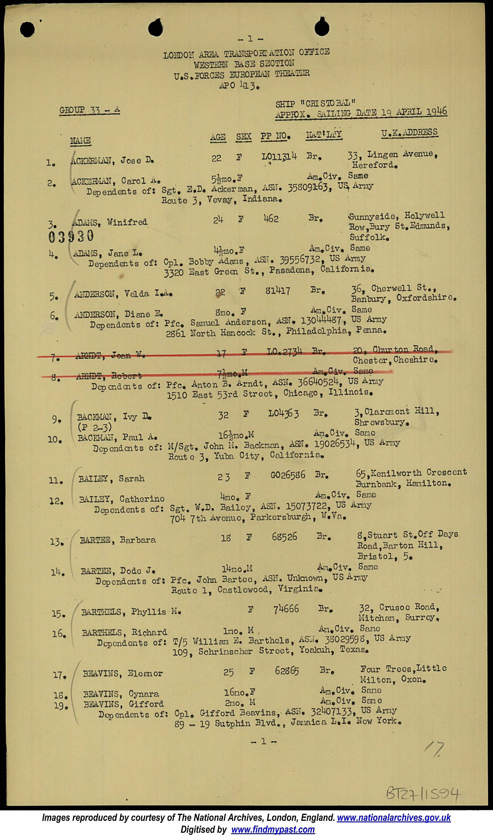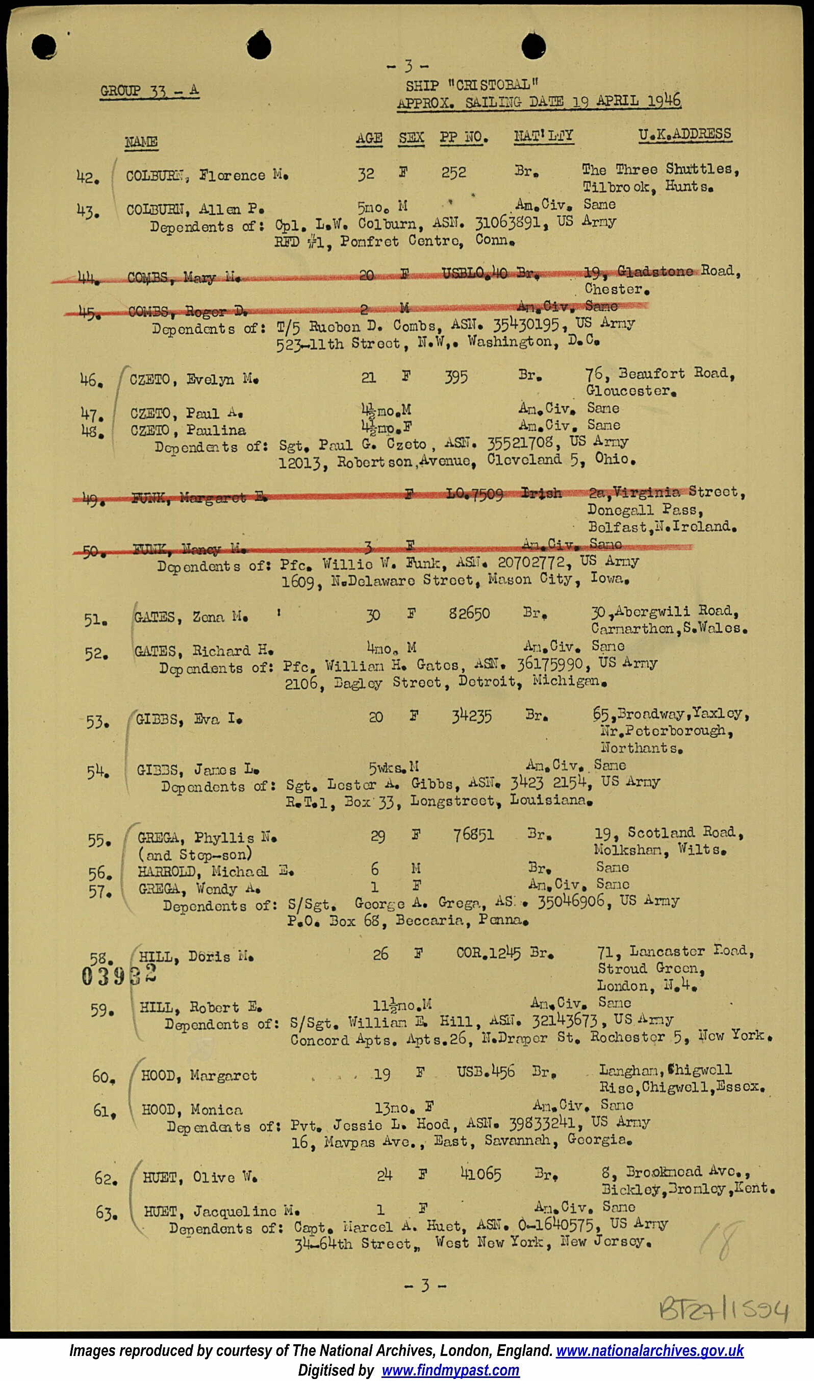 The UK departure list is marked: Dependents of Pfc William H. Gates ASN 36175990.US Army