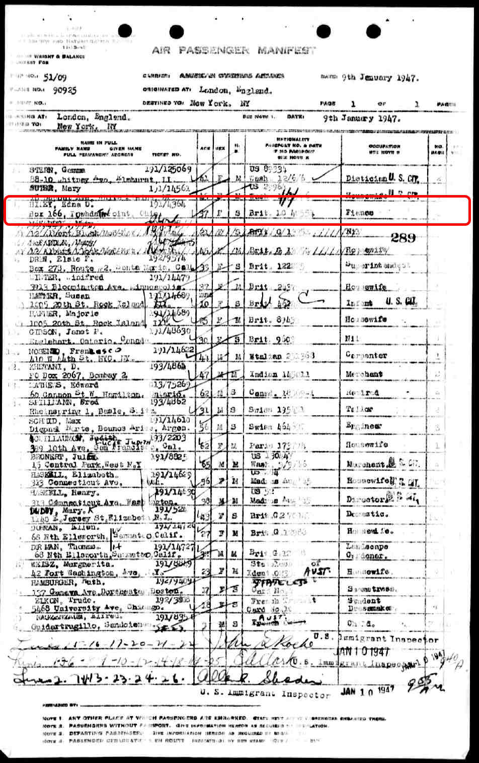 The manifest shows her as ‘Fiance’ – with her future husband’s address in Powhatan Point.