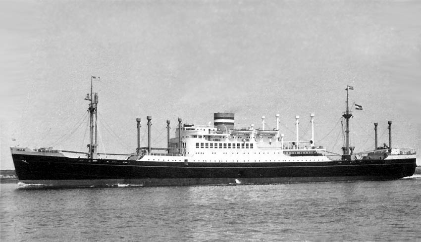 The Zaandam was torpedoed without warning several hundred miles from Recife, Brazil, November 2, 1942, while bound from Cape Town to the United States. She sank in less than ten minutes. On board the liner had been a total of 299, of which 169 were passengers. Ultimately only 169 were to survive the ordeal.